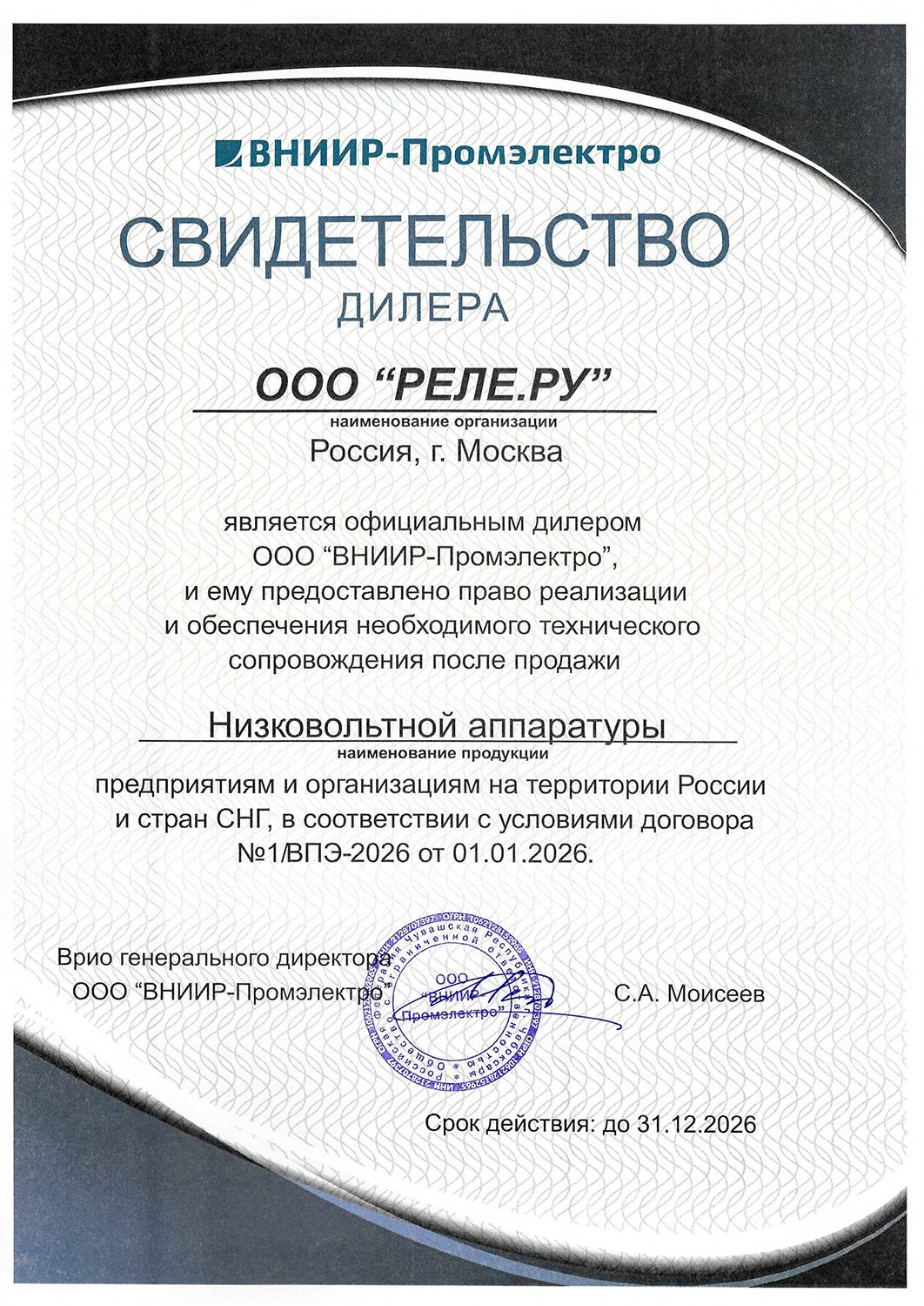 Дилерский сертификат на право реализации продукции ООО "ВНИИР — Промэлектро"